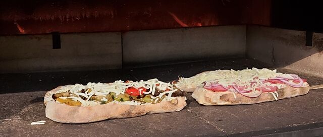 Nach dem Backen wird das Brot aufgeschnitten und mit verschiedenen Spezialitäten belegt. Nun wird es ein zweites mal gebacken und ofenfrisch serviert.